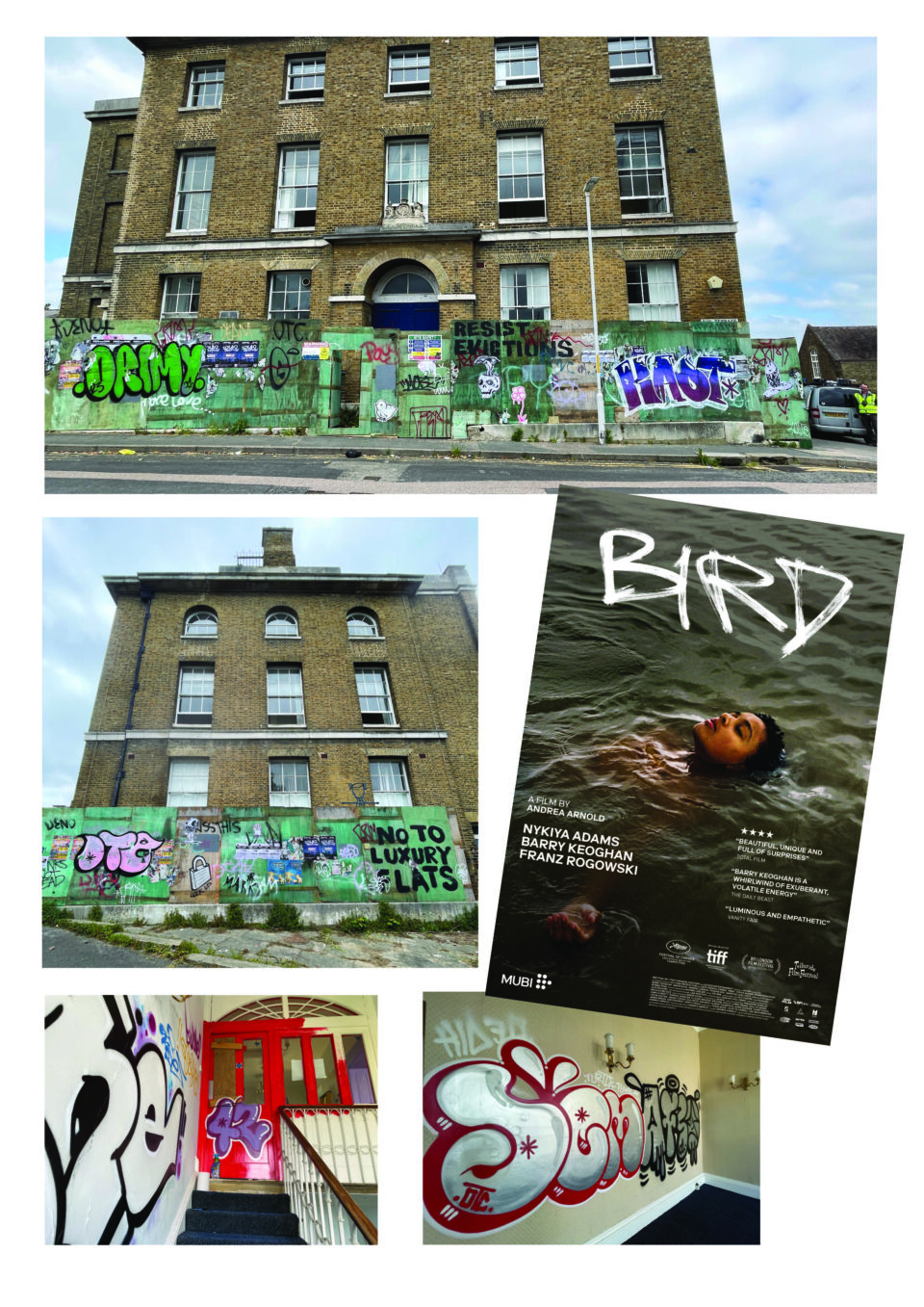 Interior and exterior Set Design for the film Bird. Hoardings to look old and distressed with 80s style slogans and graffiti. Internal squat with tags , graffiti and doodles in various rooms.